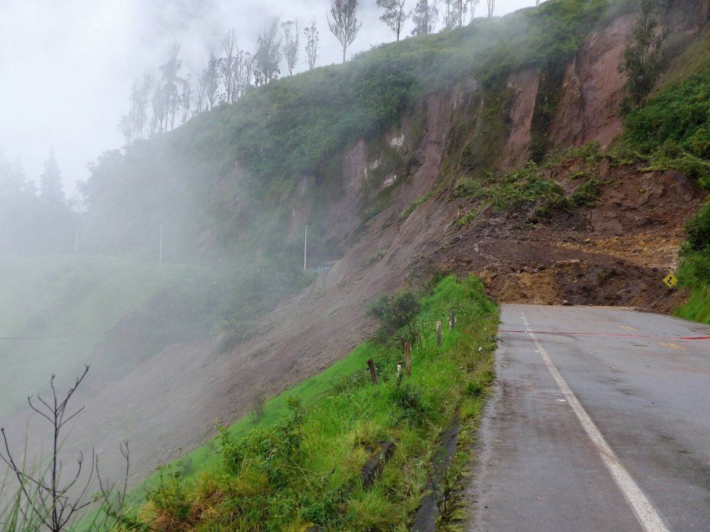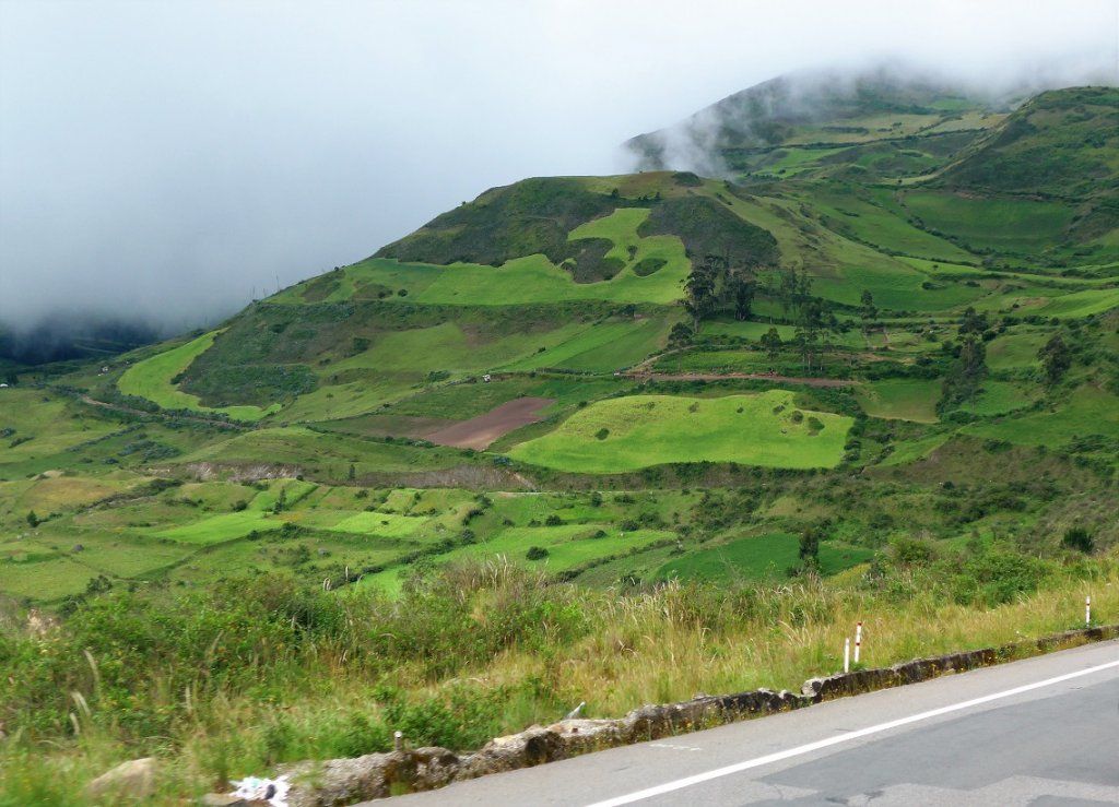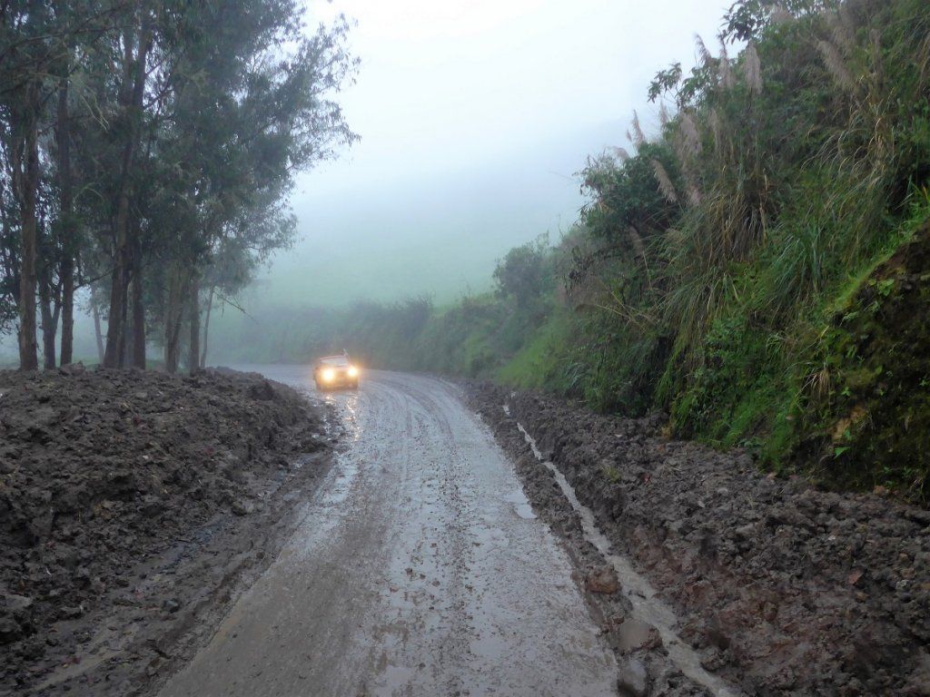 Die Weiterfahrt nordwärts stellt dann einige Anforderungen an den Chauffeur. Die guten Strassen Ecuadors, die sich über eine wunderschöne, kurvenreiche Bergstrecke schlängeln, sind von Steinschlag und Erdrutschen arg in Mitleidenschaft gezogen worden. Zudem zieht streckenweise dichter Nebel auf. Plötzlich sehen wir auf unserer Fahrbahn ein paar Steine liegen. Hat das etwas zu bedeuten? Und was? Nach der nächsten Kurve wird’s klar: Ein rotes Band über die ganze Strassenbreite und dahinter ein unüberwindbarer Erdrutsch. Fertig lustig, umkehren! Die Alternativroute, ebenfalls von den Erdrutschen betroffen, ist nass und schmierig. Wir sind einmal mehr froh um unser robustes Auto.