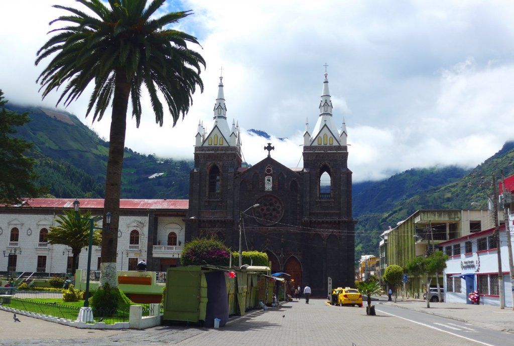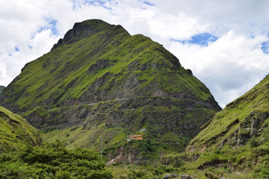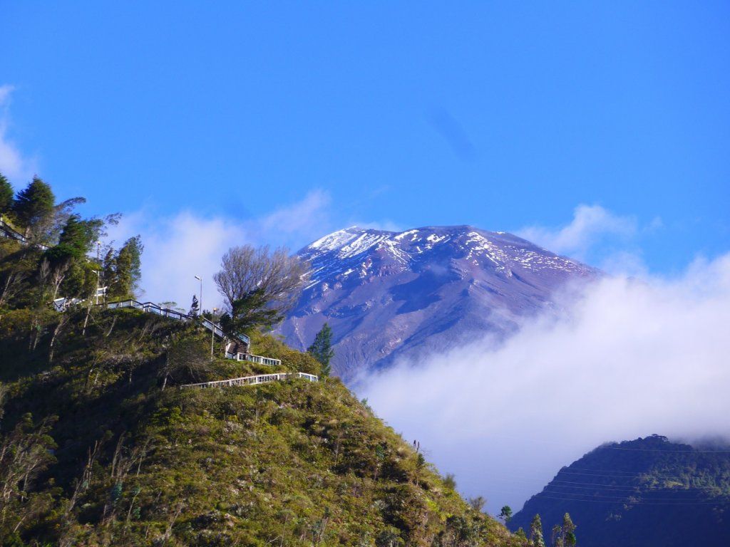 Am nächsten Tag kommen wir nach aussichtsreicher Fahrt in Baños an, einem hübschen, kleinen Wallfahrtsort mit Thermalbädern auf 1800m. Die Thermalquellen verdankt Baños dem aktiven Fünftausender Tungurahua, und den möchten wir natürlich auch sehen. Wir wandern durchs Dorf auf eine Anhöhe und schauen den rasch vorbeiziehenden Wolken zu, bis sich der Gipfel des Vulkans für ein paar Minuten enthüllt.