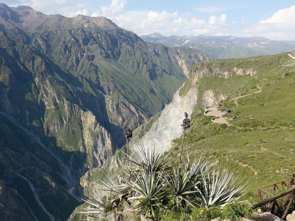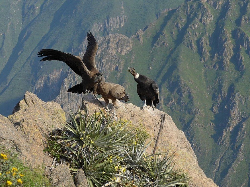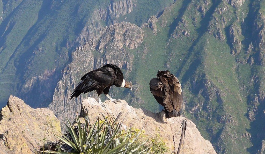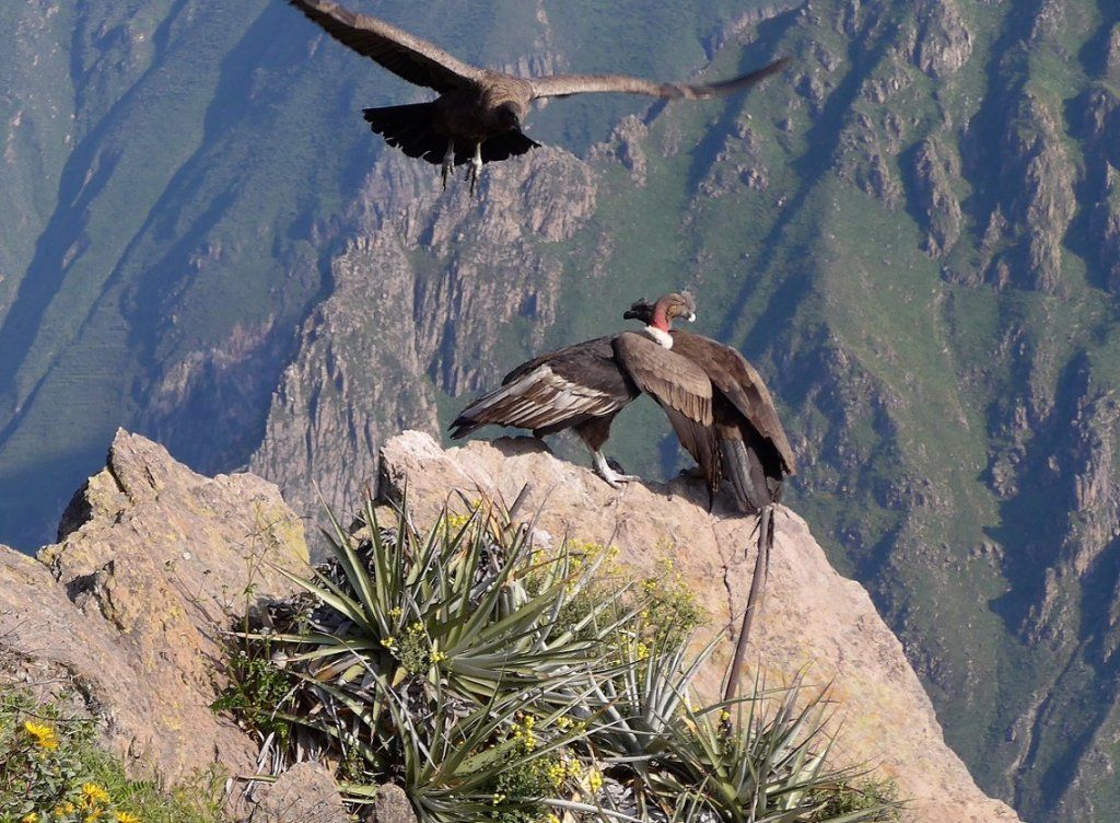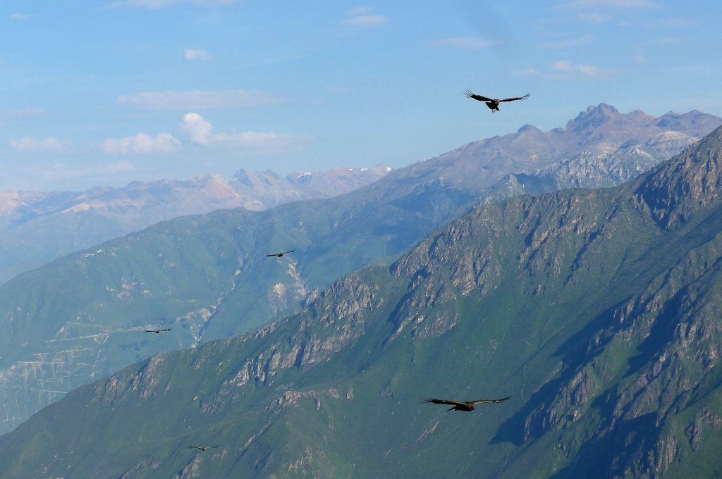 Schon beim Frühstück um 6.30 Uhr kommt der erste Kondor vorbei. Wir lassen alles liegen und eilen zum Aussichtspunkt, von wo sich das Spektakel bestens beobachten lässt. Es sind etwa ein Dutzend Riesenvögel, die herbeisegeln und ohne einen einzigen Flügelschlag durch die Lüfte gleiten. Dann wieder sitzen sie auf einen Felsvorsprung,turteln liebevoll oder streiten, je nachdem wer sich alles auf dem Felsen einfindet.