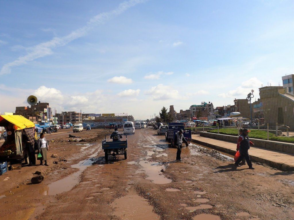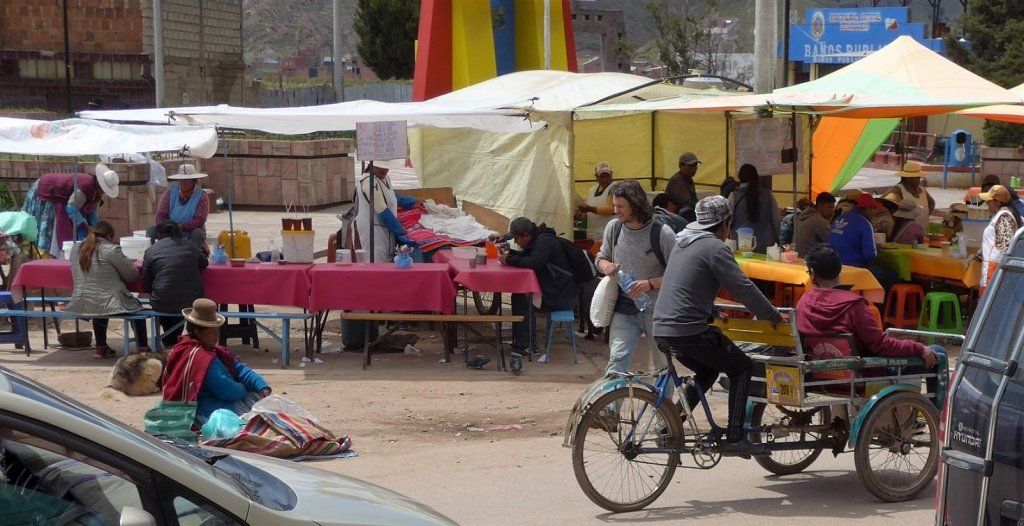 Am Sonntagmorgen, 2. April, kommen wir zum Grenzdorf Desaguadero, wo wir nirgendwo den Weg zum Zoll sehen. Die Dorfstrassen sind wie üblich schmierige, löcherige Erdpisten und wir sind der europäischen Meinung, dass wenigstens die Strasse zum Zoll asphaltiert sein müsste. Wie kann es sein, dass ein Grenzübergang nicht signalisiert ist und man ihn nicht findet, ohne sich zuerst bei verschiedenen Personen durchzufragen?