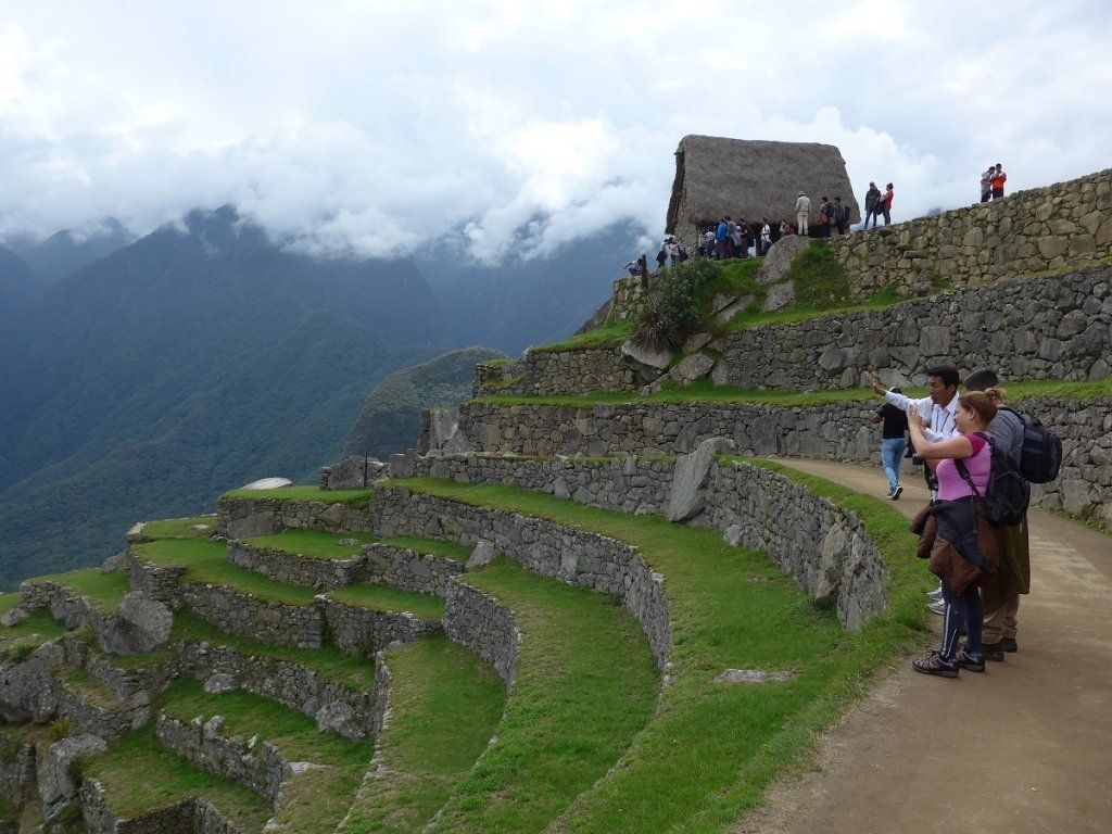 Nach der anderthalbstündigen Bahnfahrt werden wir in Aguas Calientes erst durch den Markt geschleust, bevor wir uns bei der Busstation in die lange Schlange stellen können, um Tickets für die Fahrt in die Höhe zu kaufen. Endlich sitzen wir in einem der pausenlos pendelnden Busse und werden zum lange ersehnten Ziel hinaufgezickzackt. In der Hochsaison besuchen täglich 2500 Touristen den heiligen Ort. Jetzt ist nicht Hauptsaison, aber viel weniger sind es wohl nicht. Immerhin verteilt sich der Ansturm auf dem grossen Gelände, ohne dass man sich gegenseitig auf die Füsse tritt.