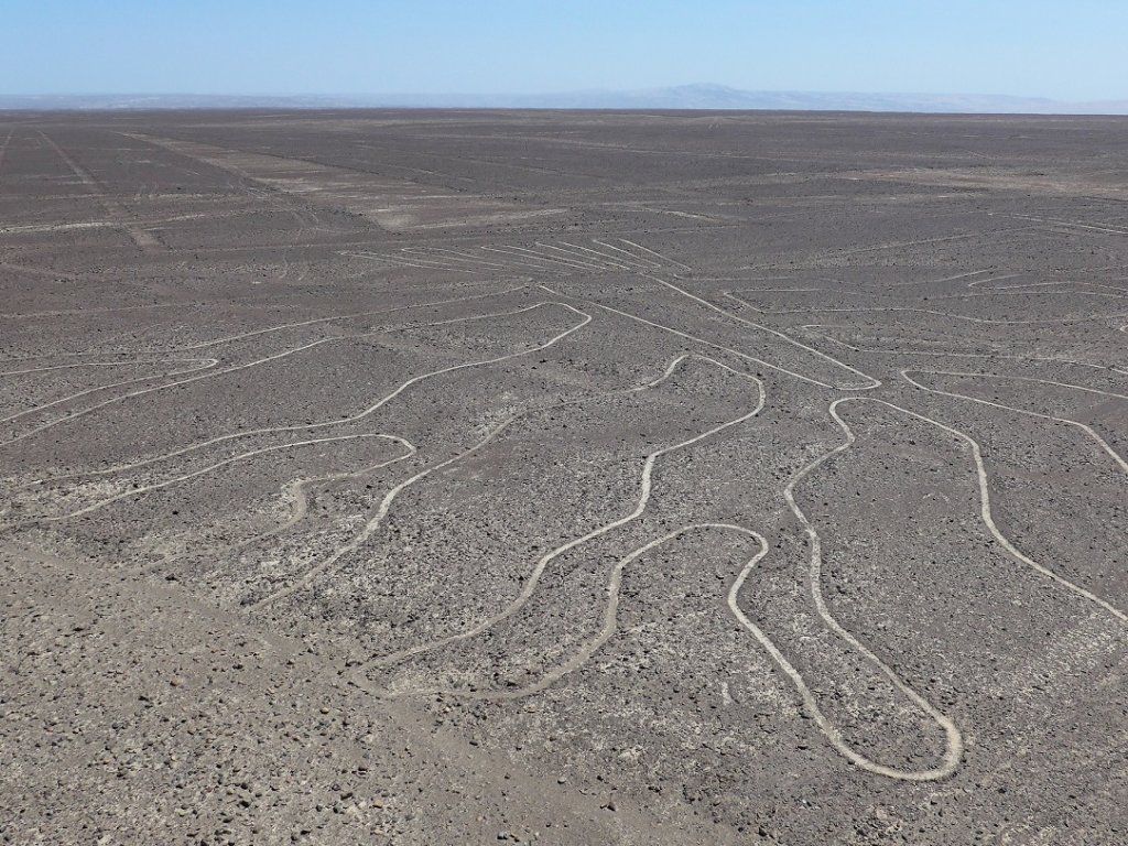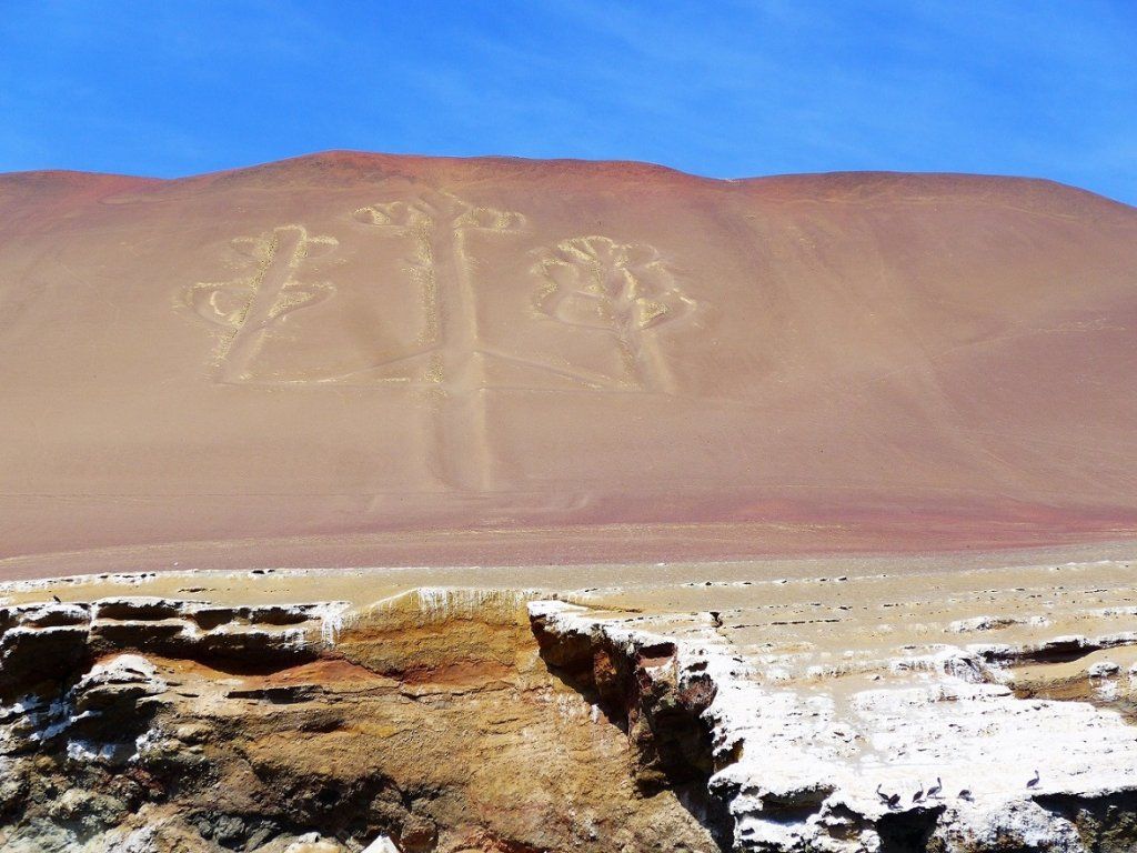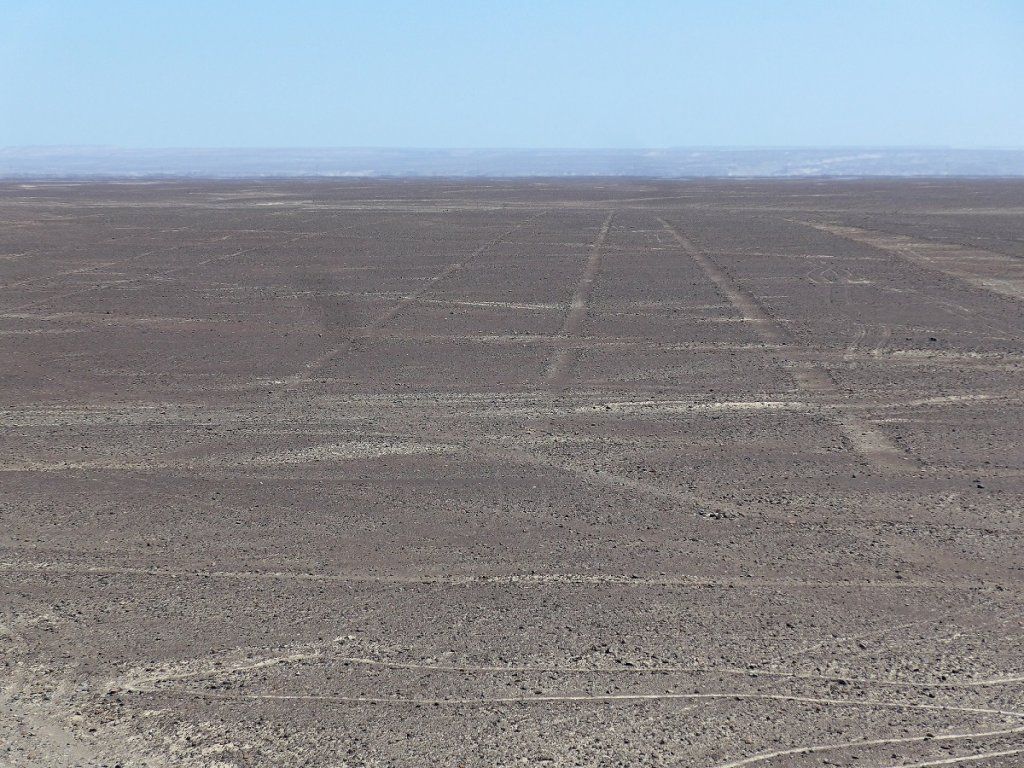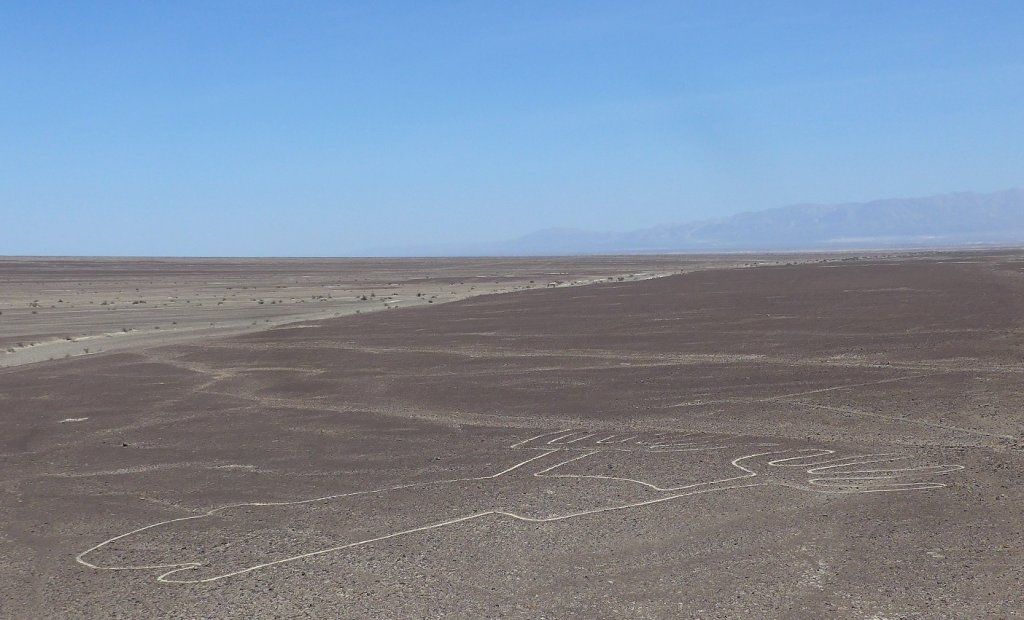 Auf dem Weiterweg kommen wir an einem Aussichtsturm vorbei, wo man einige der berühmten Nazca-Linien sehen kann. Die Geoglyphen der Nazca-Kultur umfassen ein Gebiet von 700 km2. Es sind über 100 geometrische Figuren, etwa 1000 gerade Linien, die bis 5 km lang sind sowie 30 tier- und menschengestaltige Abbildungen. Die Furchen sind nur daumentief und 20 cm breit. Durch Abtragen der oxydierten, eisenhaltigen dunklen Bodenoberfläche kommt die darunter liegende helle, sandgelbe Schicht zum Vorschein. In der praktisch regenlosen Wüste von Nazca blieben die rätselhaften Erdzeichnungen bereits über 1500 Jahre erhalten.
