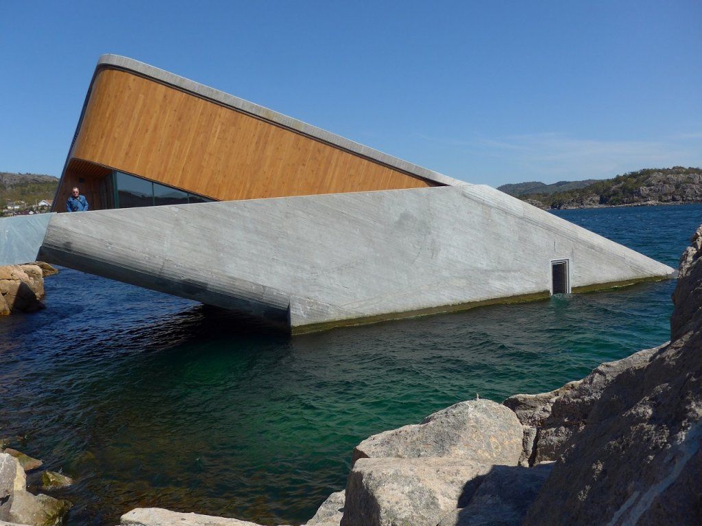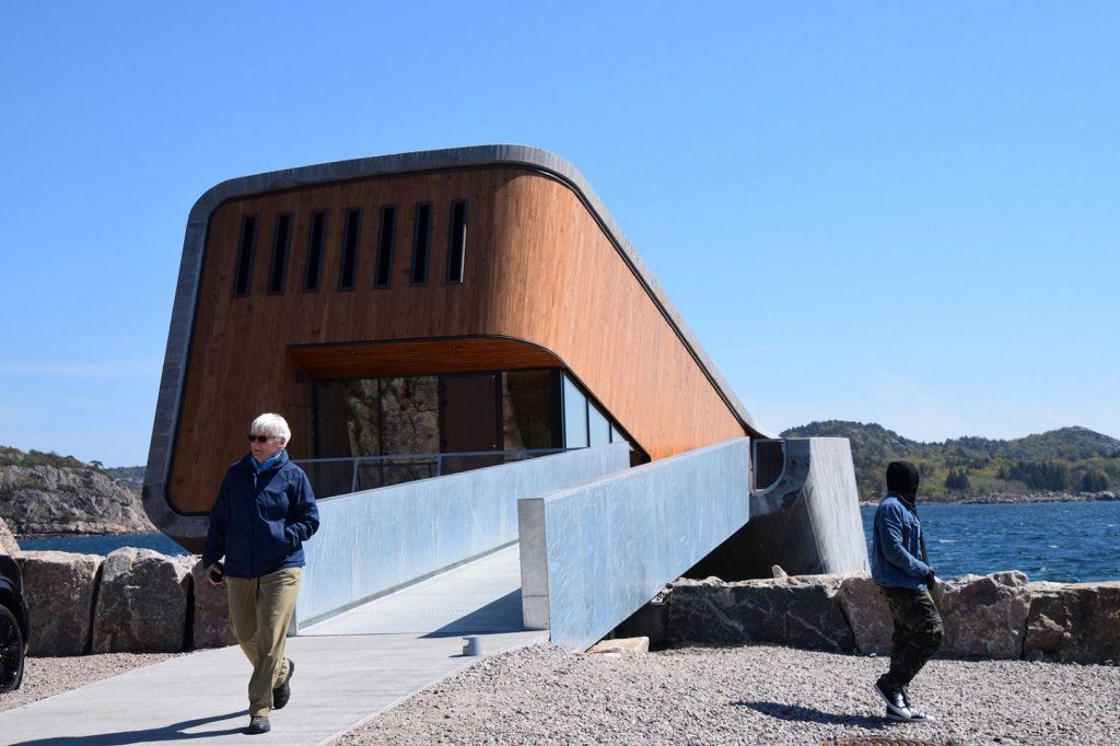 Auf der Weiterreise beäugen wir noch von aussen das neue Unterwasser-Restaurant in Lindesnes, wo man 5 Meter unter der Wasseroberfläche nobel dinieren und gleichzeitig die Fische beobachten kann. Für schlappe SFr. 270.- pro Person wird ein 17-Gänge-Menü (oder sind's 19?) serviert. Getränke sind extra, versteht sich, und werden zu einem dem Menü angepassten Preis angeboten. Da hätte man unbedingt das andere Portemonnaie mitnehmen sollen! Erstaunlich: das Restaurant ist bereits bis im Oktober ausgebucht! Weitere Buchungen können unter www.under.no getätigt werden.