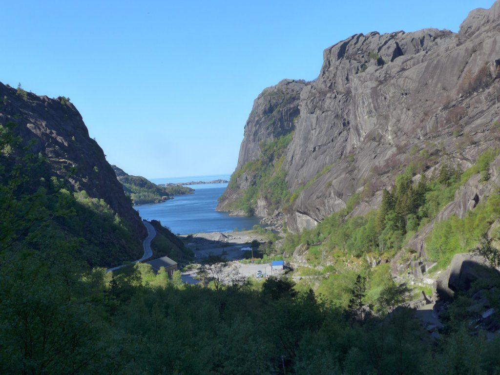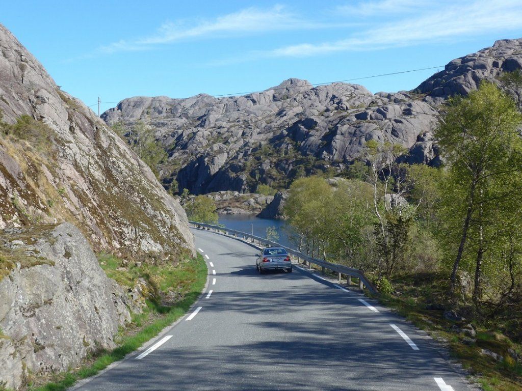 Für die Strecke bis Stavanger nehmen wir die Küstenstrasse, die "Touristenstrasse" genannt wird. Diesen Namen trägt sie zu Recht, es ist eine abwechslungsreiche Berg- und Talfahrt zwischen rund geschliffenen Granitfelsen mit immer wieder herrlichen Aussichten. Dann fällt die Strasse unvermittelt auf Meereshöhe ab und versetzt uns in eine andere Welt: Alles flach, viel Landwirtschaft mit entsprechend vielen Fliegen, schöner Sandstrand. Die Nacht verbringen wir in einem Nachbarort von Stavanger. Morgen ist der 17. Mai, Norwegens Nationalfeiertag. Wir haben keine Ahnung, wie dieser gefeiert wird und lassen uns überraschen.