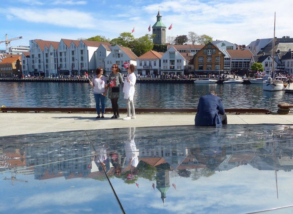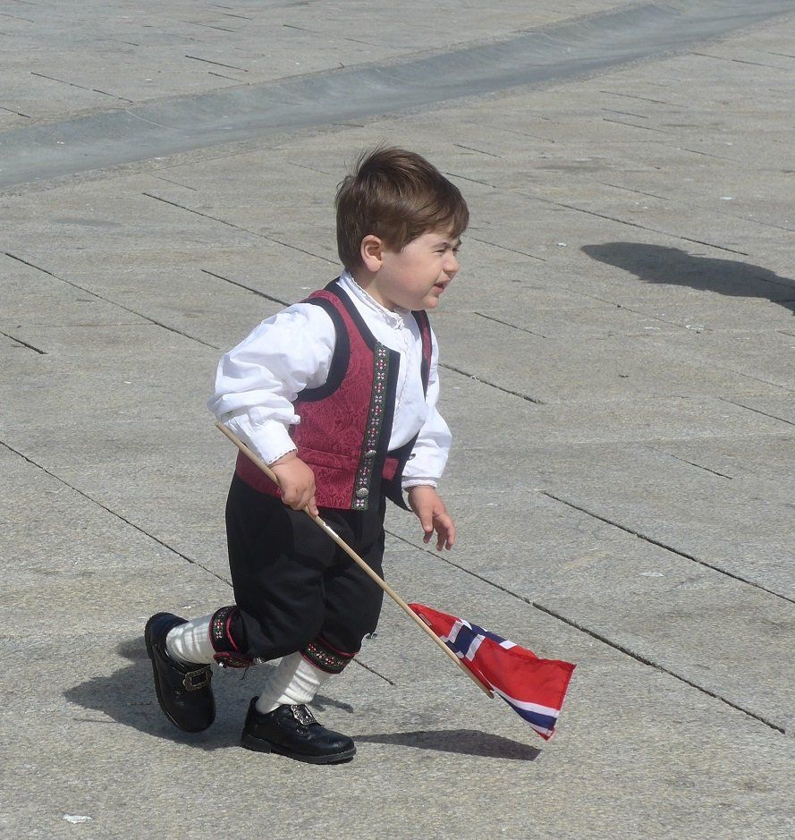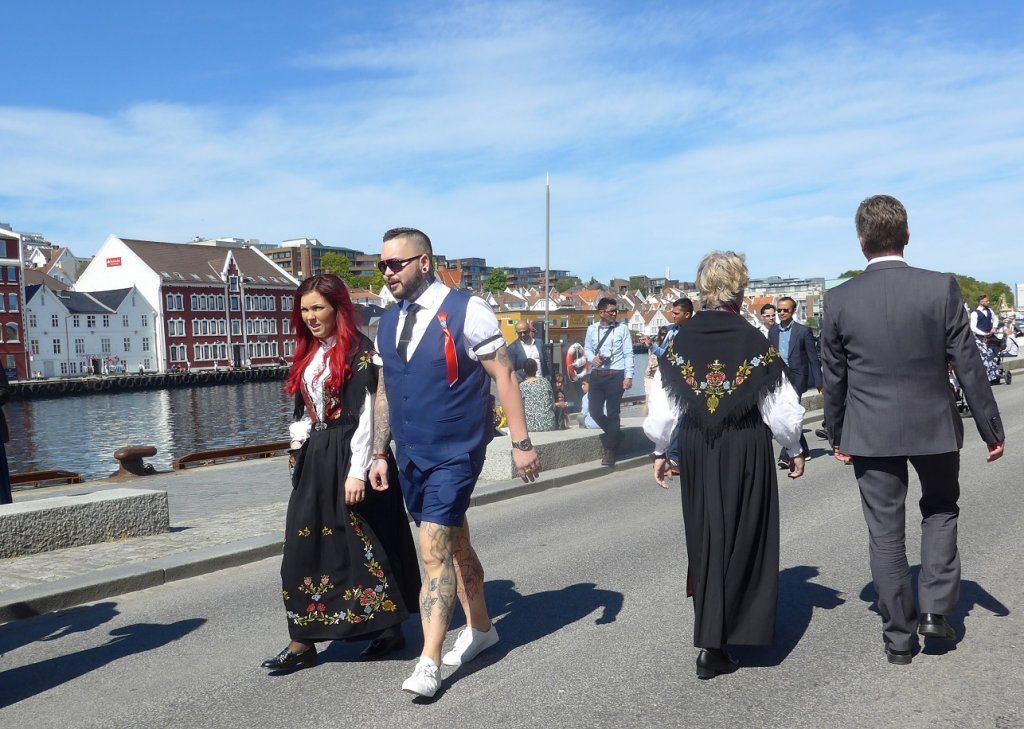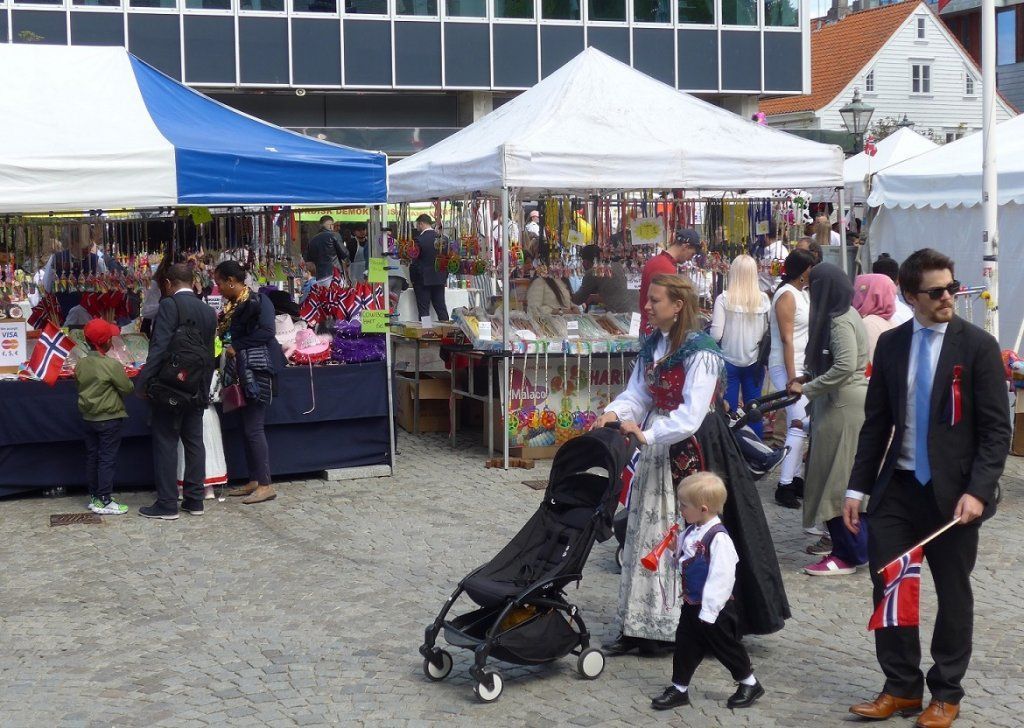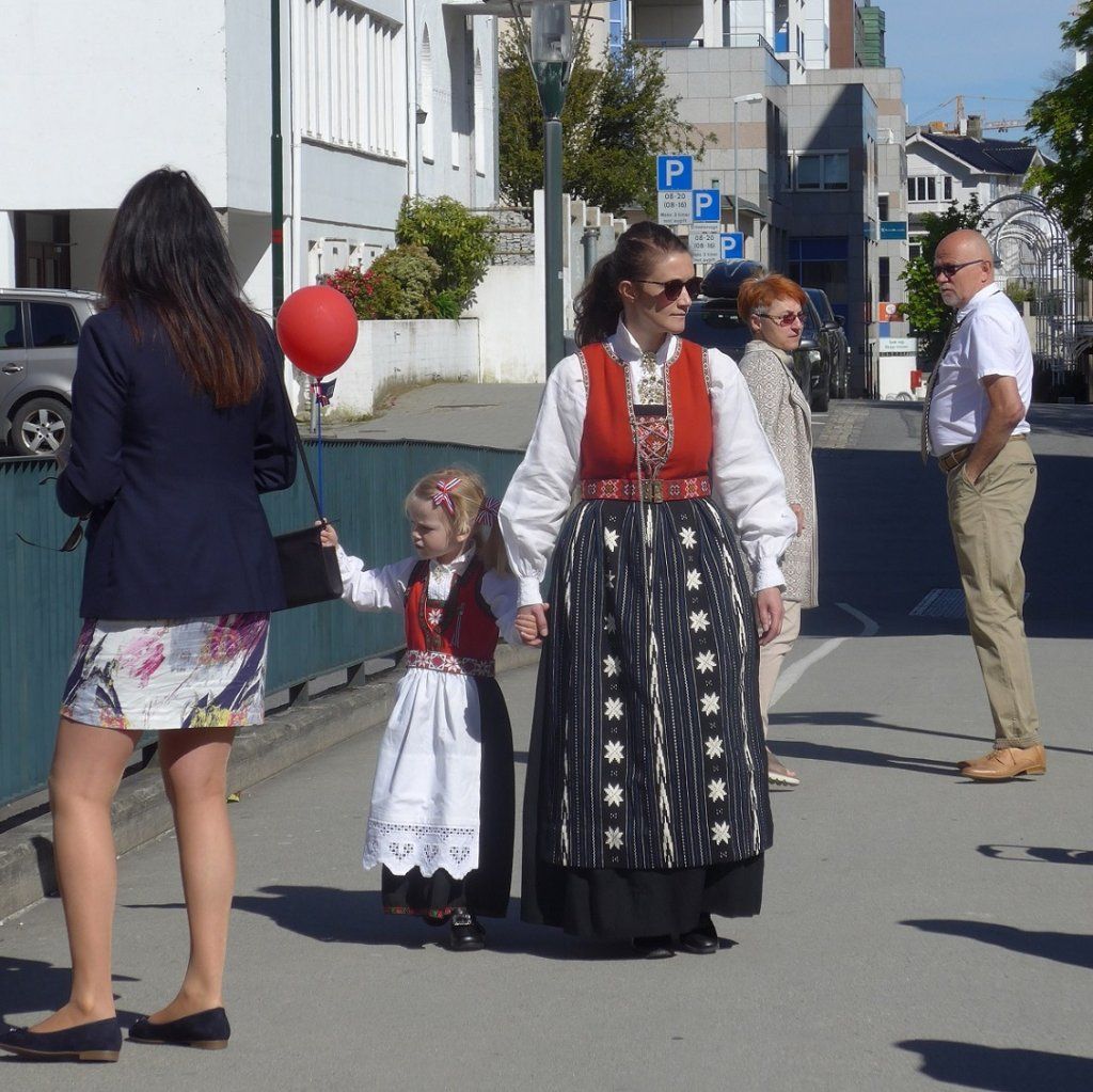 Die Überraschung beginnt bereits vor dem Frühstück mit der Landeshymne, die in der Nähe unseres Schlafplätzchens erschallt. Schön gekleidete Leute sind schon auf der Strasse, Frauen und Mädchen in Trachten, Männer und Knaben in Anzügen. Auch die Kinder sind entsprechend eingekleidet. Wir machen uns auf den Weg nach Stavanger, mit rund 140'000 Einwohnern die viertgrösste Stadt Norwegens, und sind gespannt, was uns erwartet. Zuerst erwarten uns überfüllte Parkplätze, aber nach einigem Suchen finden wir trotzdem noch einen. Dann fussen wir stundenlang durch die Stadt und lassen uns von der Festlaune anstecken. Umzüge, Musik, wunderschöne Trachten, tausende Norwegen-Fahnen und Fähnchen und strahlende Sonne bei über 20°C.