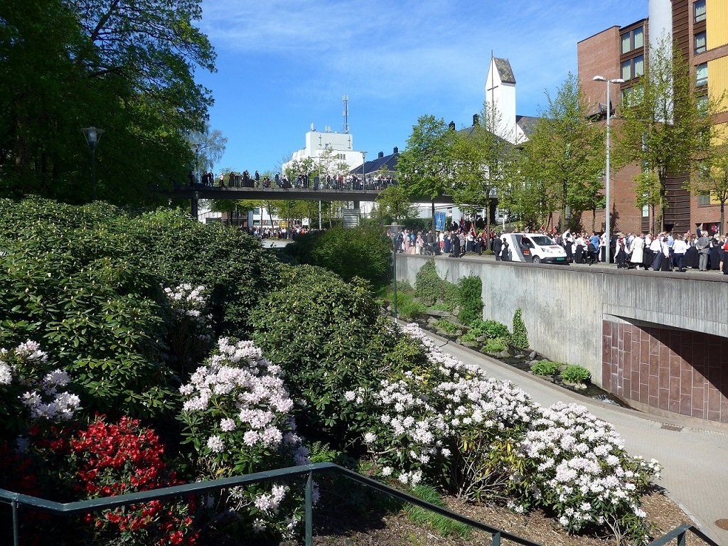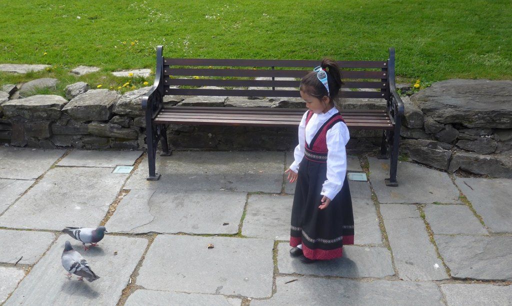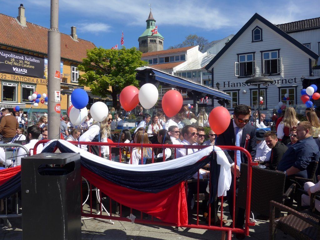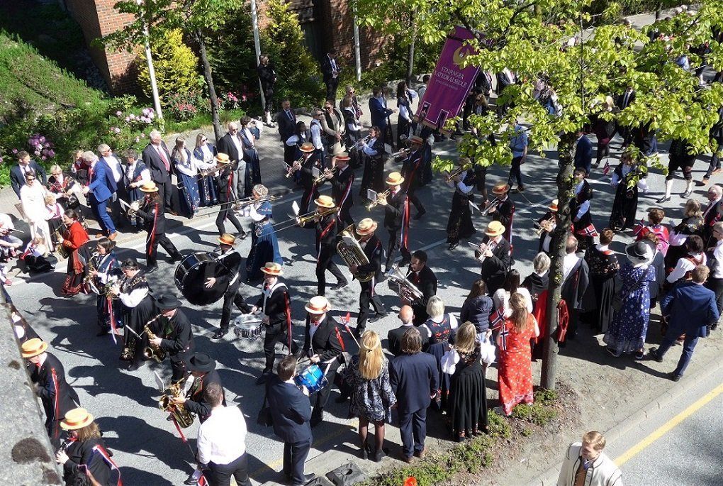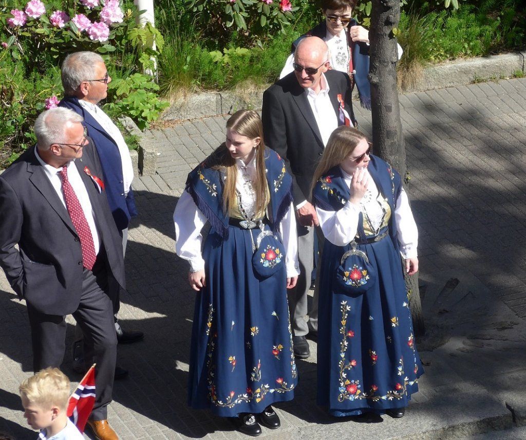 Die Überraschung beginnt bereits vor dem Frühstück mit der Landeshymne, die in der Nähe unseres Schlafplätzchens erschallt. Schön gekleidete Leute sind schon auf der Strasse, Frauen und Mädchen in Trachten, Männer und Knaben in Anzügen. Auch die Kinder sind entsprechend eingekleidet. Wir machen uns auf den Weg nach Stavanger, mit rund 140'000 Einwohnern die viertgrösste Stadt Norwegens, und sind gespannt, was uns erwartet. Zuerst erwarten uns überfüllte Parkplätze, aber nach einigem Suchen finden wir trotzdem noch einen. Dann fussen wir stundenlang durch die Stadt und lassen uns von der Festlaune anstecken. Umzüge, Musik, wunderschöne Trachten, tausende Norwegen-Fahnen und Fähnchen und strahlende Sonne bei über 20°C.