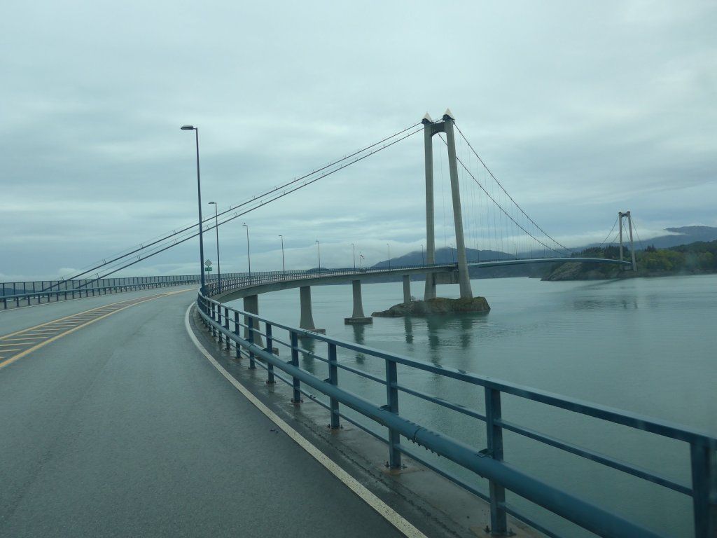 In der Nacht und am folgenden Morgen tropft's vom Himmel. Petrus muss ein Norweger sein, am 8. und am 17. Mai lässt er die Sonne auf die Freiluftfeiern scheinen, nachher darf's auch mal wieder regnen. Wir sind nun auf dem Weg nach Bergen, die Strasse hüpft von Insel zu Insel, über Brücken, Unterwassertunnels und zwei Fährpassagen. Mit der Zeit wird auch das Wetter wieder besser.