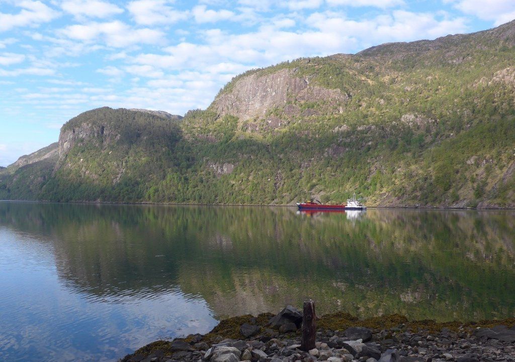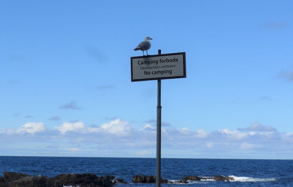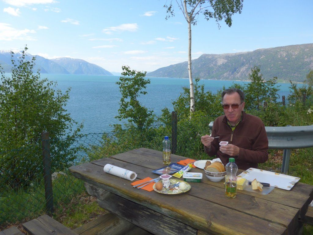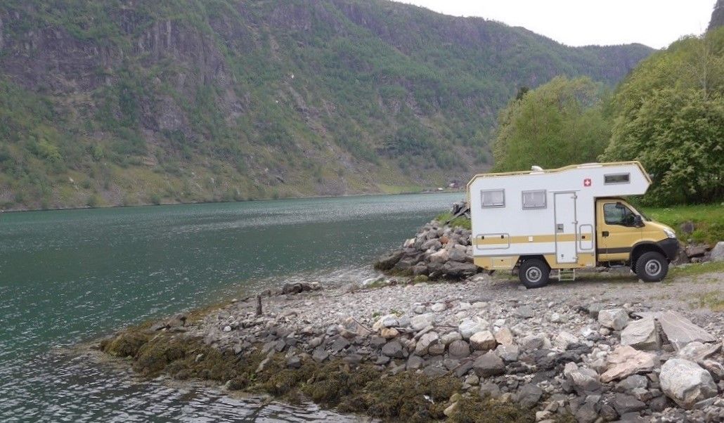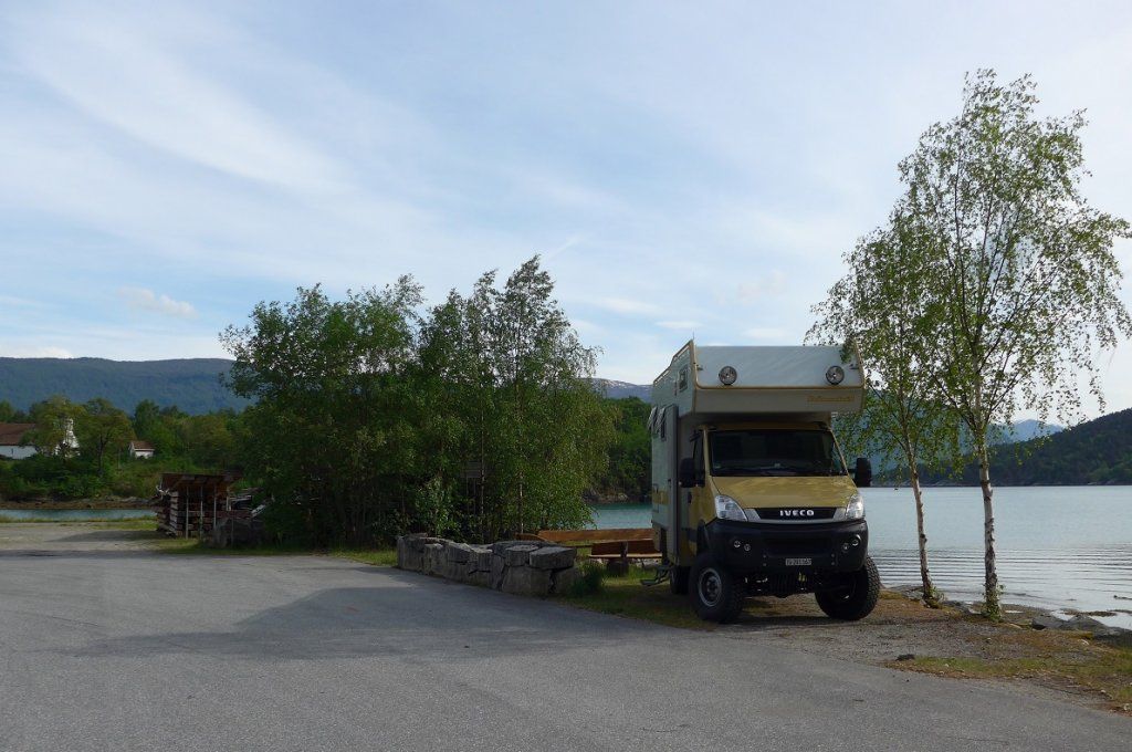 Die Weiterreise Richtung Norden bietet fantastische Landschaften und idyllische Übernachtungsplätze. Einer dieser von uns auserkorenen Plätze ist besonders schön an einem Fjord gelegen und hat nur einen Haken: Der Kiesplatz ist abhaldig Richtung Wasser. Heinz hat mit sowas keinerlei Probleme. Mutig fährt er rückwärts so nahe wie möglich ans Ufer, legt den 1. Gang ein, zieht die Handbremse und steigt aus. Es hebet! Mir ist wind und weh, ich spüre schon förmlich, wie das Wohnmobil mitten in der Nacht ins Rutschen gerät und mit uns im Meer versinkt. Zu meiner Beruhigung schafft Heinz grosse Steine und einen massiven Holzbalken herbei und positioniert alles hinter den Rädern. Dann lässt er das schwere Auto in diese Hindernisse rollen. Das alleine würde bereits reichen und zusammen mit dem 1. Gang und der Handbremse ist eine dreifache Sicherheit gegeben. Ich atme tief durch und schicke ein Stossgebet Richtung Himmel.