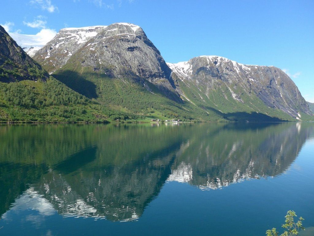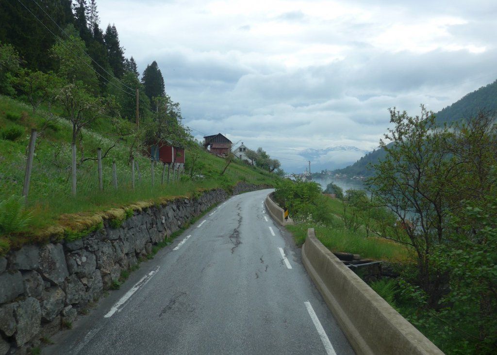 Diesmal auf dem Landweg erreichen wir den Sognefjord in seiner sonnigen Variante und setzen mit der Fähre hinüber nach Lavik. Auf der Nordseite des Fjords folgen wir der Berg- und Talstrasse ostwärts bis Sogndal und drehen dann wieder in nördliche Richtung bis zum Nordfjord. Nach jeder Kurve wird die Szenerie von Neuem faszinierend. Überall schiessen Wasserfälle von den Schneebergen und Gletschern die steilen Hänge hinunter, die Blicke auf Seen und Fjorde sind herrlich. Leider nimmt die Strasse immer wieder über kurze oder längere Distanzen die Direttissima untendurch, es gibt unglaublich viele Tunnels. Das ist aus strassenbautechnischen Gründen nachvollziehbar, aber aus touristischer Sicht schade um alles, was man dabei verpasst (der Neat-Tunnel lässt grüssen!).