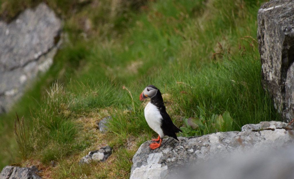 Die Insel ist felsig und klein, es gibt nur eine Uferstrasse, die die halbe Insel umrundet und nur einen Campingplatz, die einzige Möglichkeit, die Nacht im Wohnmobil zu verbringen. Die Felsklippen mit den Vögeln sind auf der gegenüberliegenden Seite der Insel. Am Nachmittag schnüren wir die Wanderschuhe und steigen 300 Meter in die Höhe. Eine zweistündige Rundwanderung ist ausgeschildert, die aber länger dauert, weil man ständig stillstehen und fotografieren muss. Wir sehen schon mal Skuas, Dreizehenmöwen, Kormorane, Tordalken und Basstölpel. Die Hauptattraktion der Insel sind die Papageientaucher, von denen hier schätzungsweise 100'000 Paare brüten. Sie kommen allerdings erst am Abend vom Meer her, um ihre Jungen zu füttern. Gegen 20-21 Uhr werden die einen und anderen müde und setzen sich in die Felsen. Das ist der Zeitpunkt, wo man die kleinen Vögel mit geeigneten Kameras "einfangen" kann.