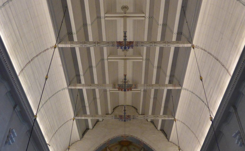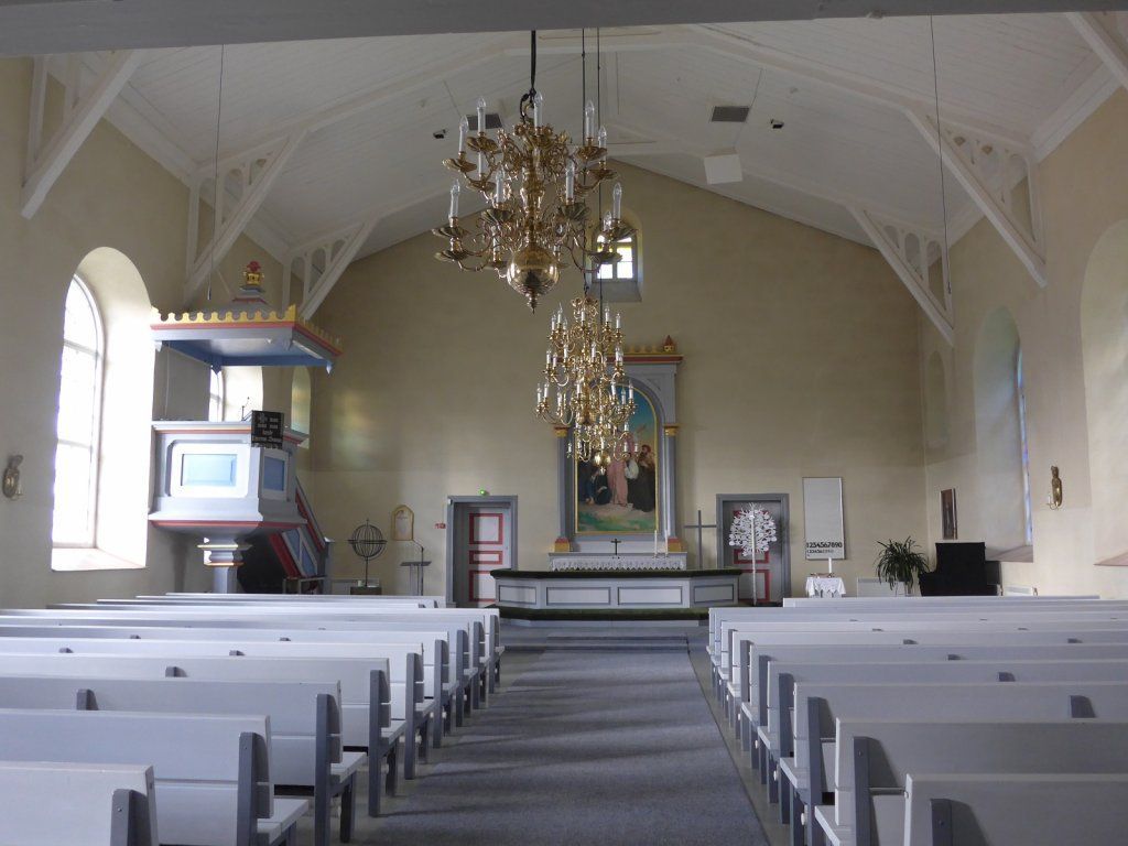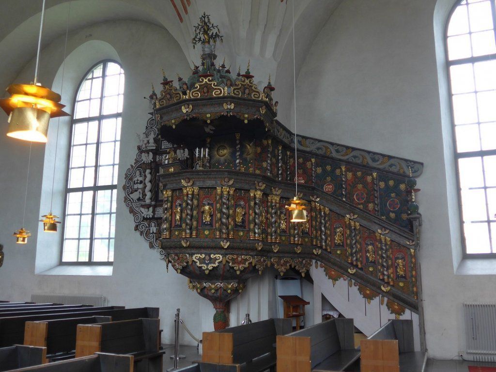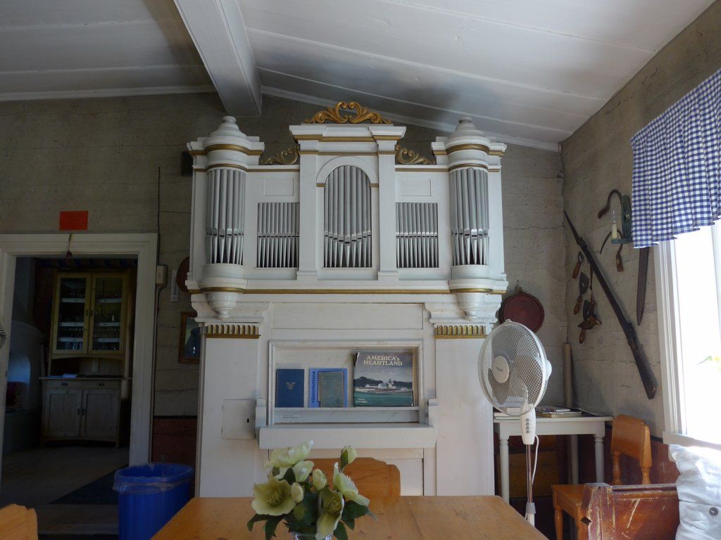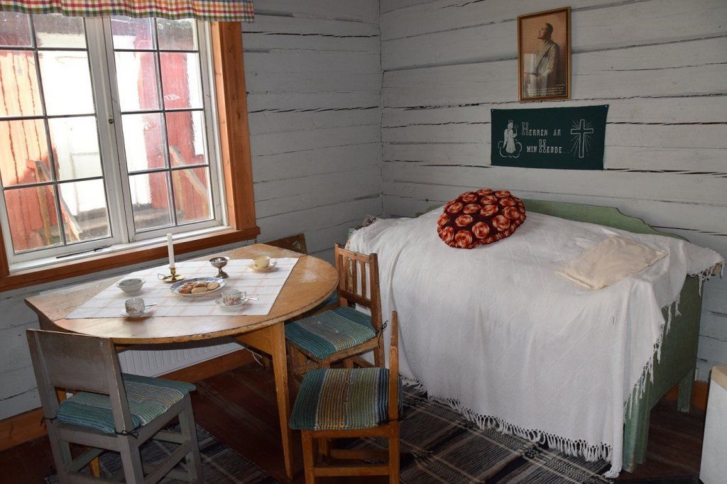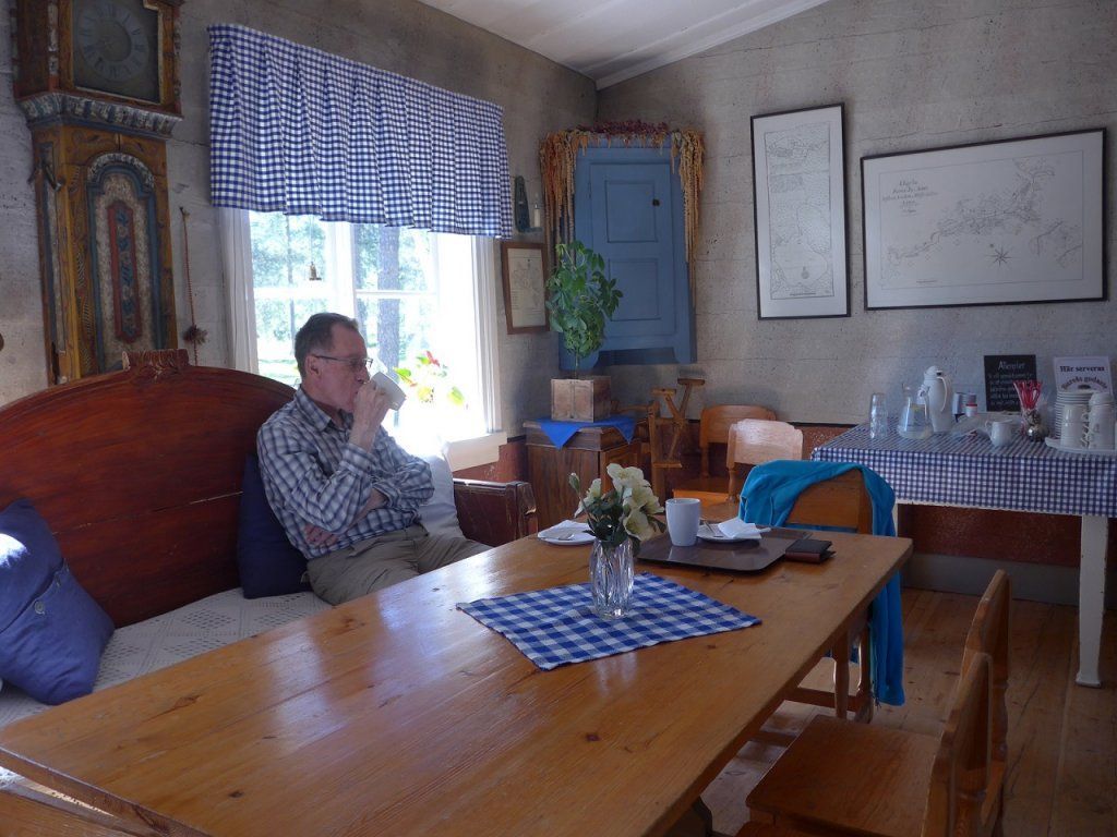 Am folgenden Tag entdecken wir am Strassenrand der E4 ein Täfeli: Café 10 km, dann 5 km, dann Café Pfeil nach links in ein kleines Dorf namens Burea (mit Ringli auf dem a, möglicherweise Büro ausgesprochen). Weit und breit kein Kaffeeschuppen, aber ein Pfeil in einen Park zu einem Haus, das uns privat vorkommt. Wir treten in die gute Stube ein und stellen fest, dass wir im Haus irgendeiner wichtigen, verstorbenen Persönlichkeit sind, deren Domizil nun als Café genutzt wird. Die entsprechende Familiengeschichte hängt in reinem Schwedisch an der Wand. Wir setzen uns aufs Sofa, konsumieren lauwarmen Filterkaffee mit Gebäck und bewundern die Heimorgel, die wohl einst von den Hausbesitzern gespielt wurde. Dann wandeln wir durch den Park zur Kirche, von der uns vor allem die verzierte Deckenkonstruktion ins Auge sticht. Das also war der Kaffee im Büro...