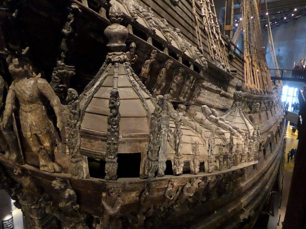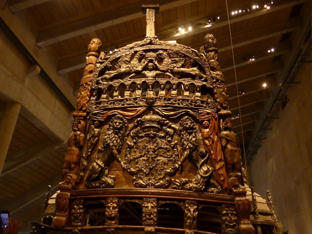 Mit einem Hop-on Hop-off Bus lassen wir uns zusätzlich an den Sehenswürdigkeiten der Stadt vorbei chauffieren. Beim Vasa-Museum hüpfen wir aus dem Bus und setzen die Stadtrundfahrt erst ein paar Stunden später fort. Die Vasa war ein Flaggschiff der schwedischen Kriegsflotte, das 1628 gebaut und mit hunderten von geschnitzten und prachtvoll ausgeschmückten Holzskulpturen verziert wurde. Das Schiff sank am Tag seiner Jungfernfahrt noch im Stockholmer Hafen. Es war das erste Kriegsschiff, das zwei Kanonendecks übereinander hatte, was die Stabilität beeinträchtigte. Nach dem Untergang gab es vier Beschuldigte: Der Schiffsbauer, der bereits ein halbes Jahr zuvor verstorben war, und der König, der keinen Verzug der Inbetriebnahme tolerierte. Weiter wurden der Admiral, der die Flotte befehligte und der Kapitän angeklagt, weil sie Anzeichen der Instabilität des Schiffes zu wenig ernst genommen hatten. Der Einfachheit halber sprach man schliesslich den verstorbenen Schiffsbauer schuldig.